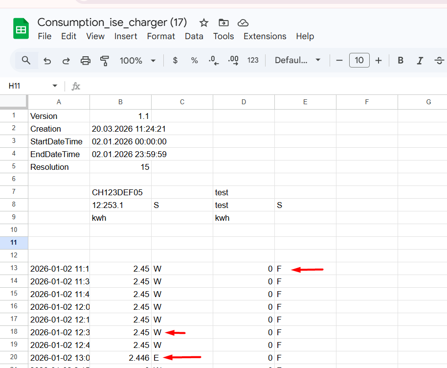 The same often happens with charging stations, which, for example, finish charging at 3:00 a.m. The customer then preheats the vehicle for 2 minutes at 7:00 a.m., for example. Now it may happen that this consumption is not transmitted in the 2 minutes (depending on the setting in the charger). There is now a discrepancy between the stop value and the transmitted values. Eponet then recalculates these and marks the values with status E.
