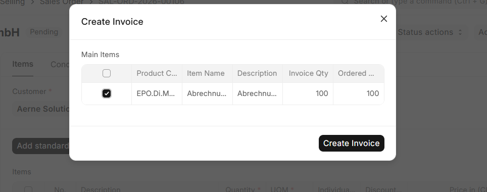 • Klicken Sie auf „Aktionen“ > „Rechnung erstellen“ — Klicken Sie in der oberen Aktionsleiste auf „Aktionen“ und wählen Sie „Rechnung erstellen“. Es erscheint ein Popup-Fenster mit den Hauptpositionen der Bestellung.